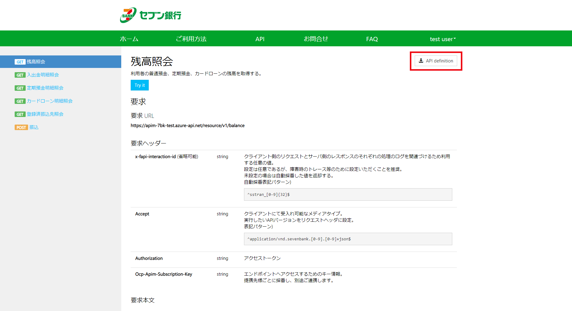 APIの仕様ページのAPI definitionボタンを押下することで、ダウンロードできます。(JSON形式)